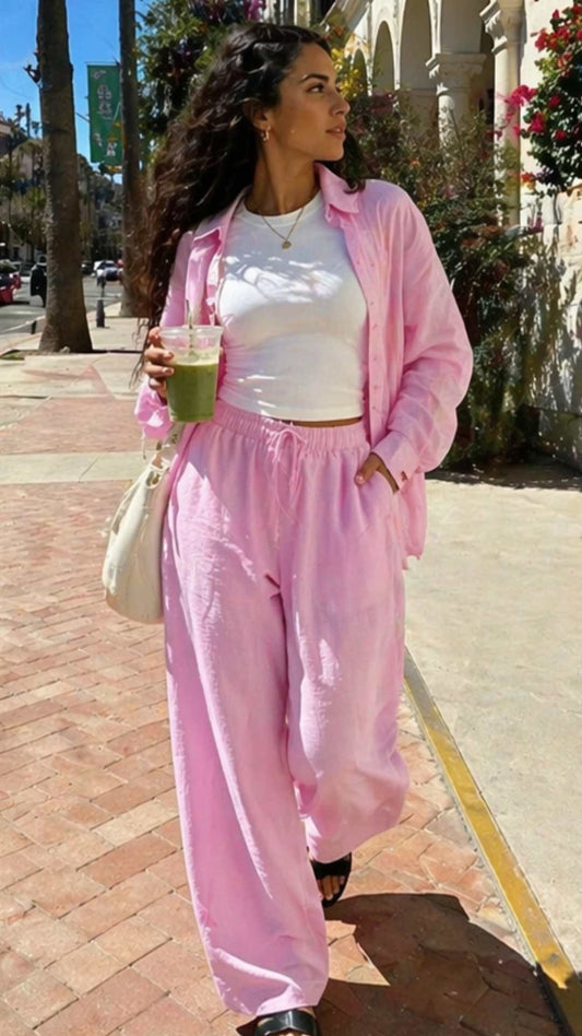 LaurenNichole Versatile Linen Cotton Lounge Outfit – Button Down Shirt & Wide Leg Pants or Shorts