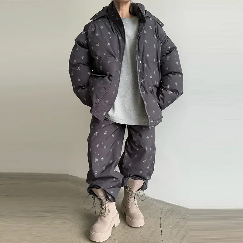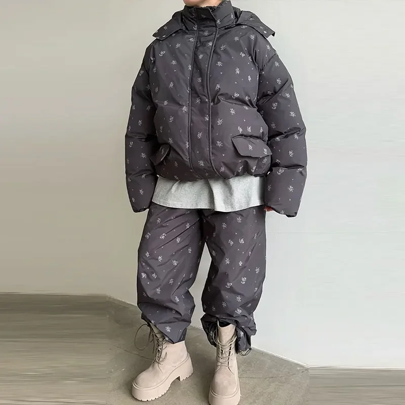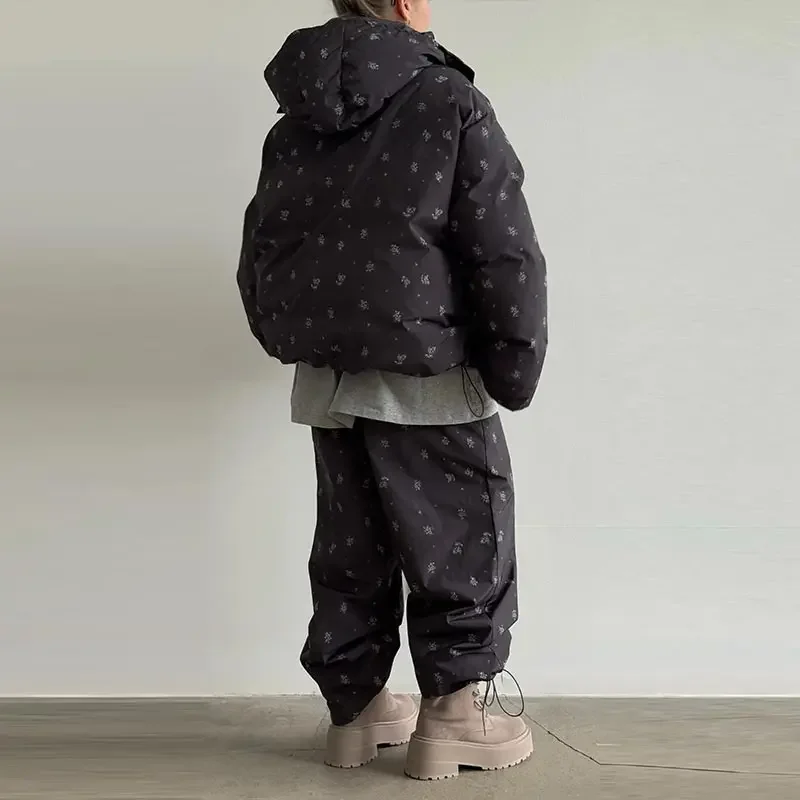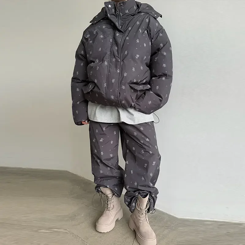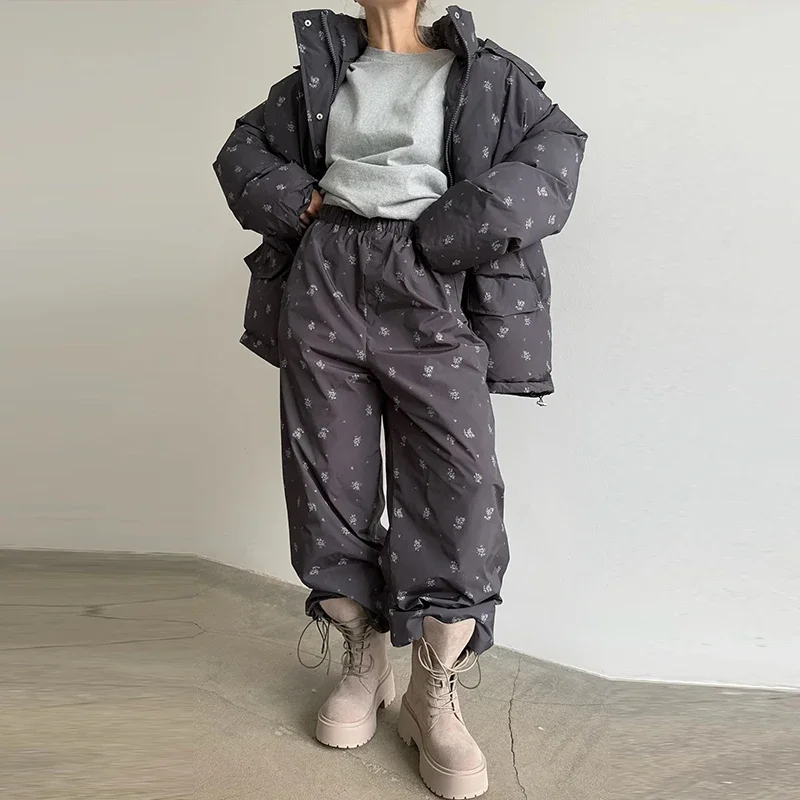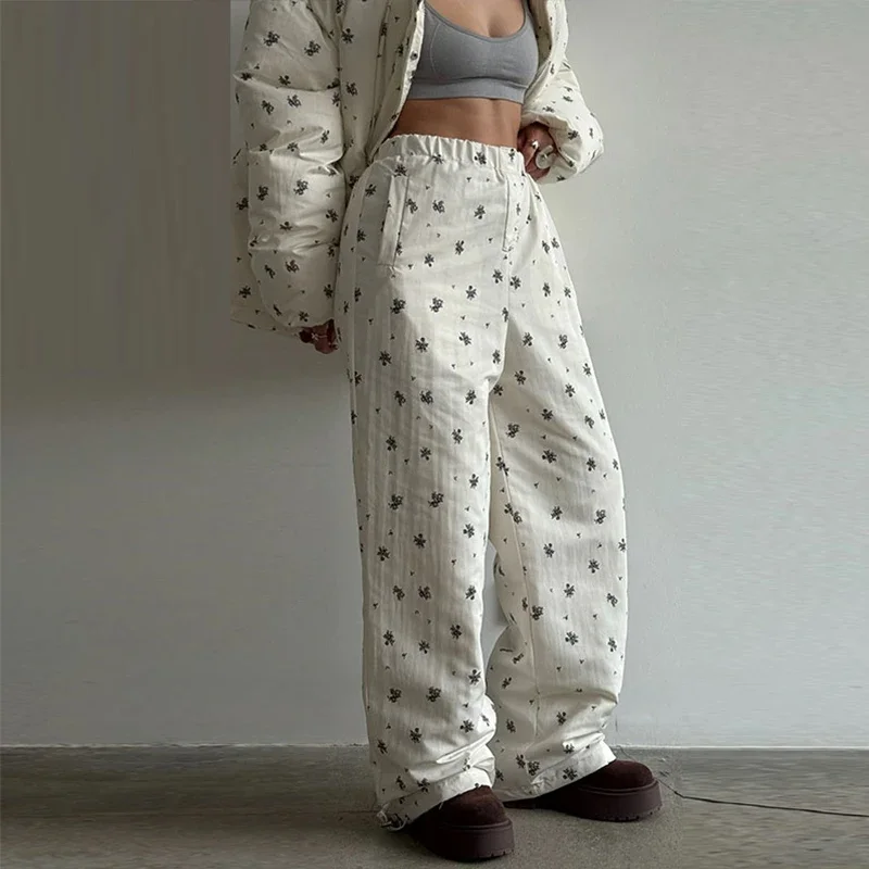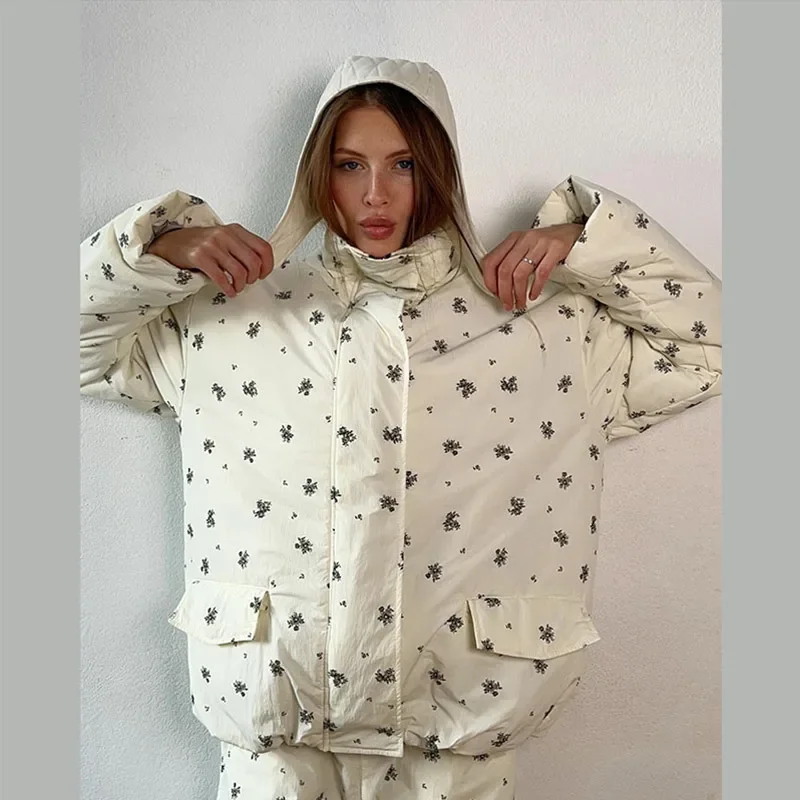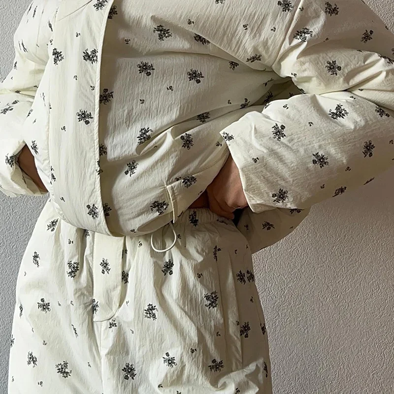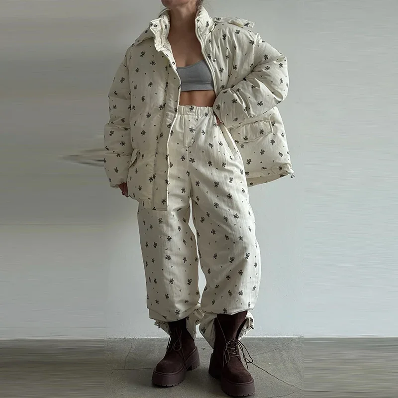 Elevate your winter wardrobe with this curated Floral puffer zip-up jacket with light hoodie. Paired with coordinating wide-leg trousers. Thoughtfully designed with practical pockets and a polished winter silhouette, this ensemble delivers understated sophistication for any casual cold-weather occasion. Cozy, lightweight, and stylish, it’s the perfect set for seasonal errands, travel, lounging, or stepping out with effortless charm.