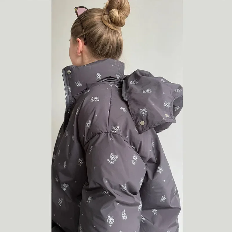 - Warm puffer-style zip-up hoodie with subtle floral detailing