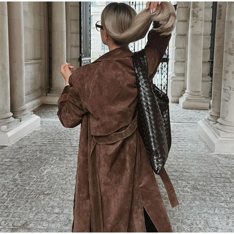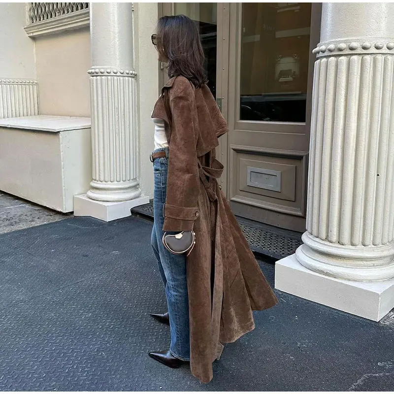 Elegant Vintage Suede Leather Double Breasted Long Coat