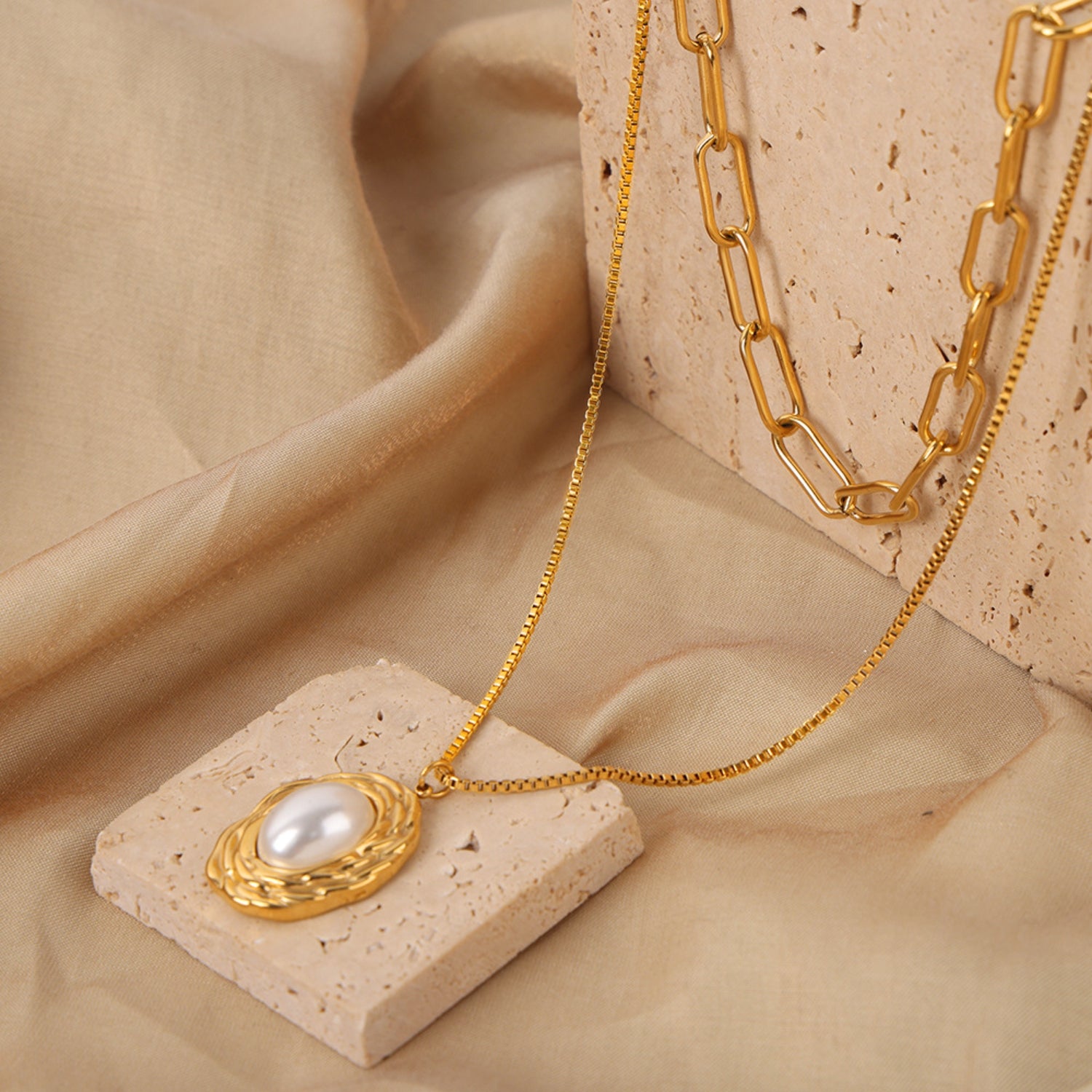 Indulge a touch of elegance with our Inlaid Pearl Double-Layered Titanium 18k Gold Plated Necklace. The lustrous pearls are delicately embedded in a double-layered design of prsemium titanium steel, providing both durability and sophistication. Elevate any ensemble with this luxurious piece.