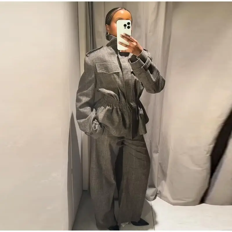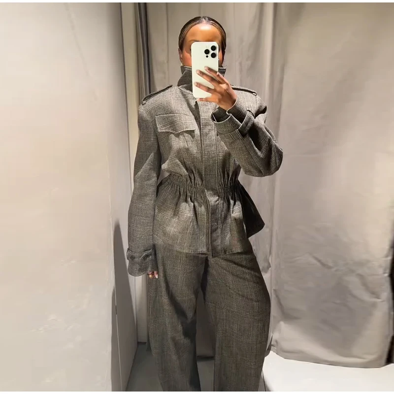 Elevate your wardrobe with the LaurenNichole La’Bond Wool Plaid Zip-Up Slim Waisted Blazer paired with wide-leg trousers, where contemporary tailoring meets effortless sophistication. Crafted from premium synthetic fibers, this two-piece delivers a structured yet comfortable fit, ideal for autumn and winter wear. The high-waist pleated trousers complement the slim-waisted zip-up blazer, creating a polished silhouette that transitions seamlessly from office settings to elevated casual moments.