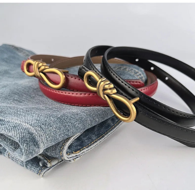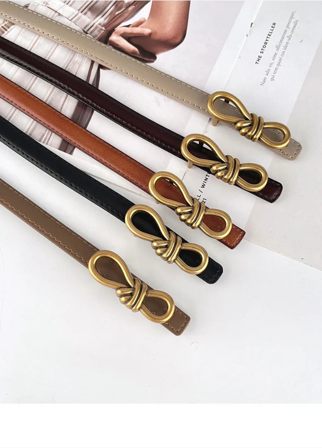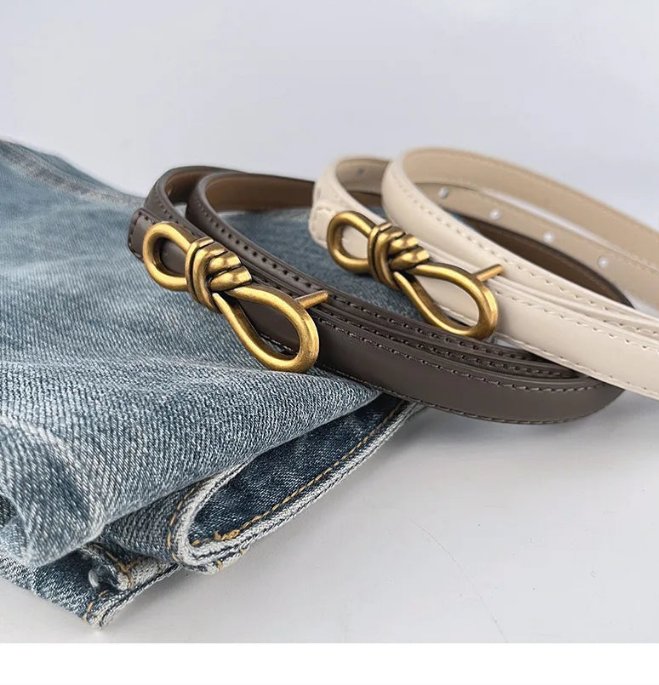 Accessorize and style your outfits with our Luxurious Quality Genuine Leather Gold Bow Buckle Adjustable Thin Belt at LaurenNichole