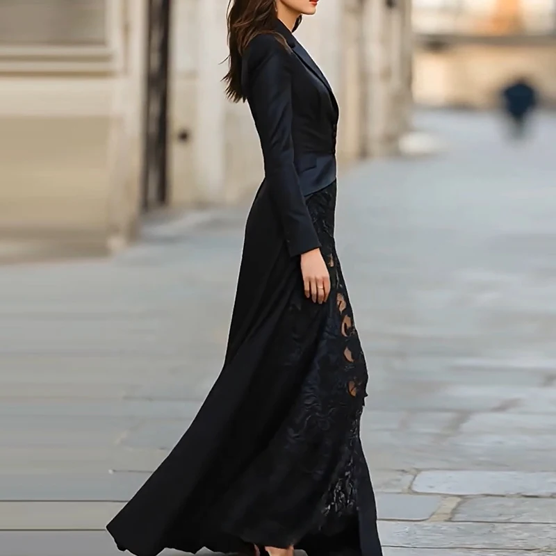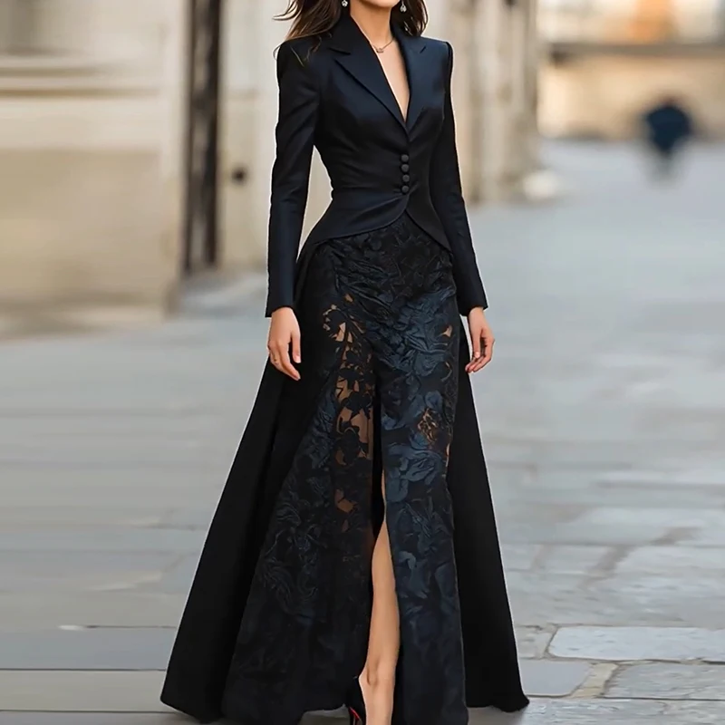 The buttoned blazer features a clean V-neck and lapel collar, while the ankle-length skirt with side lace detail adds graceful movement. Worn together or styled separately, this easy outfit delivers effortless interchangeable styling.