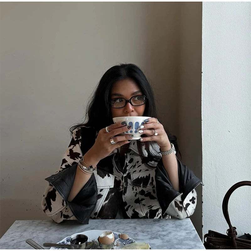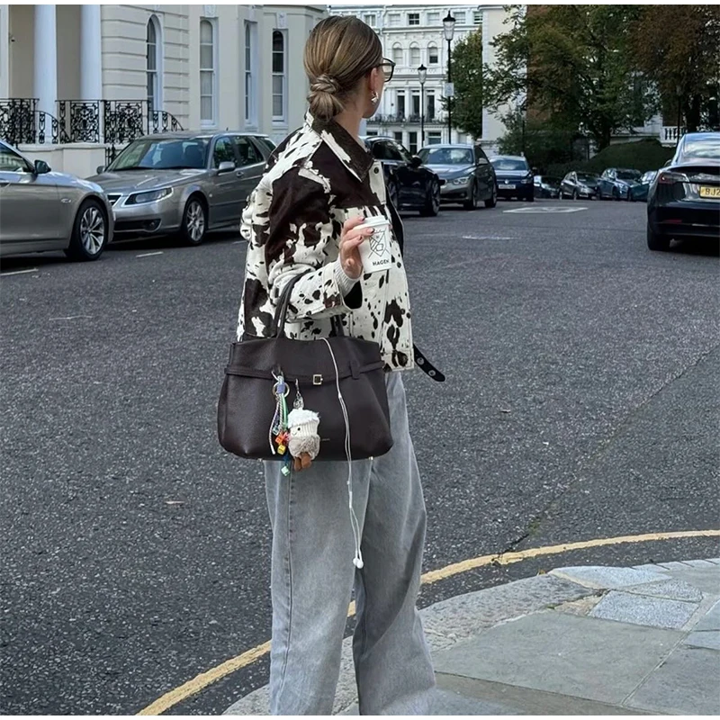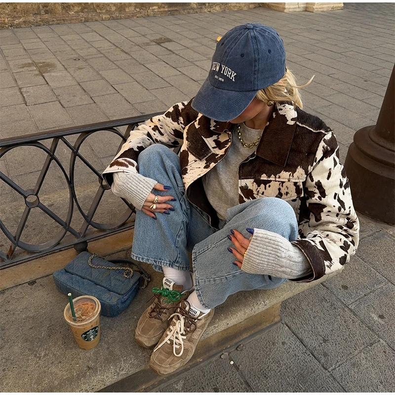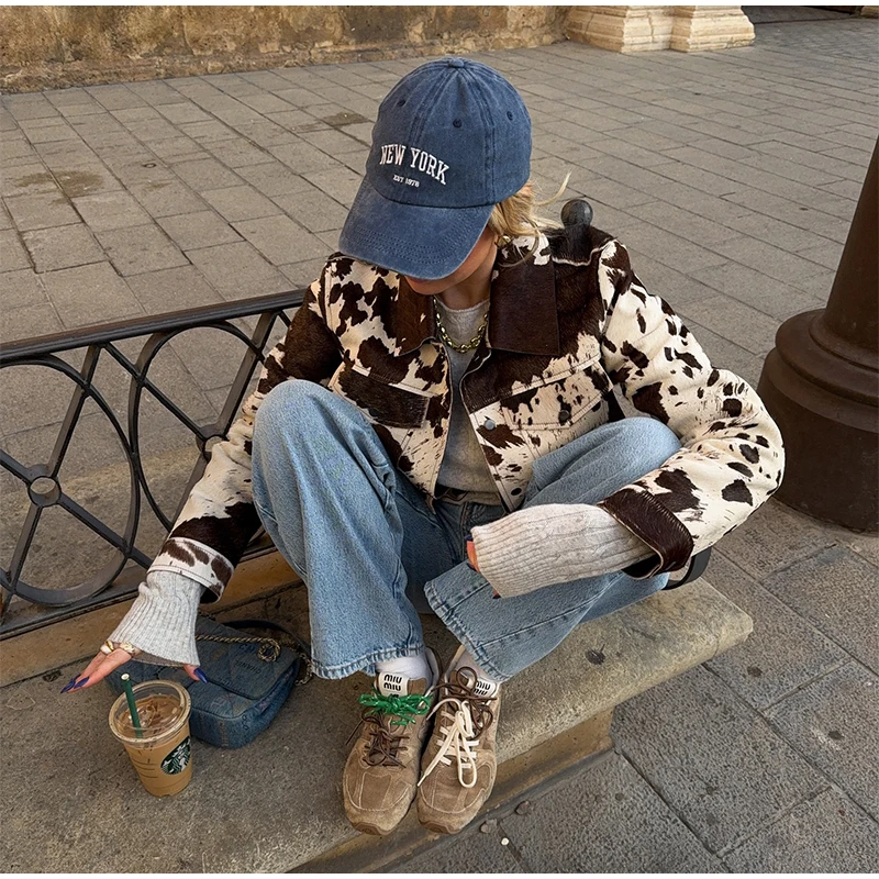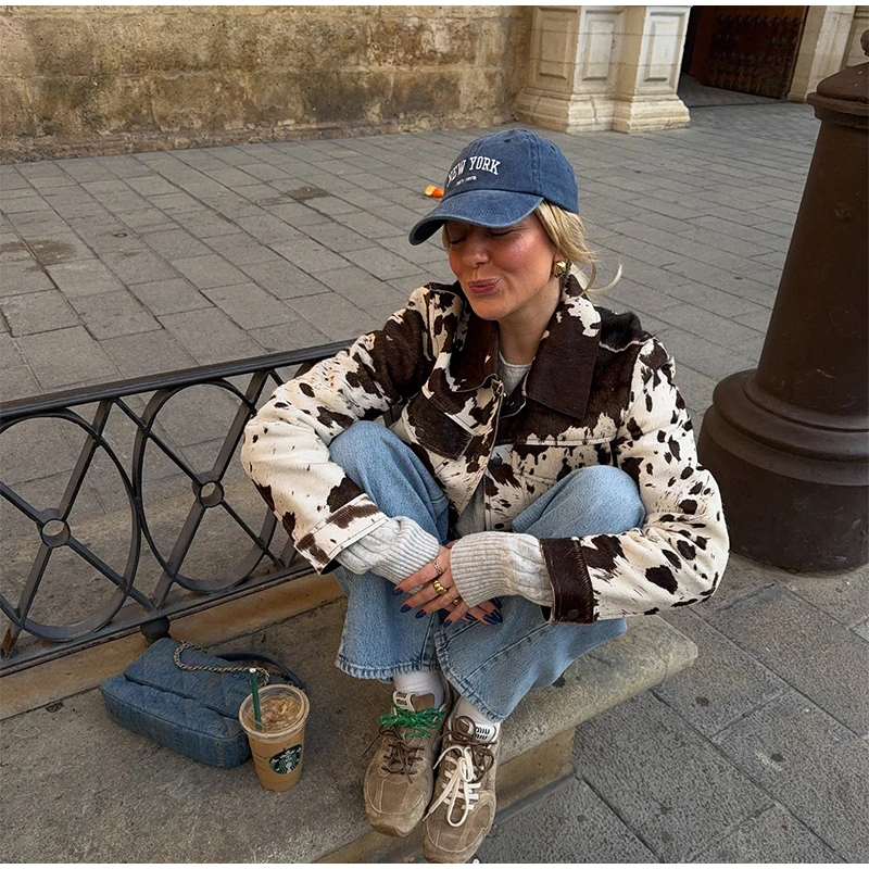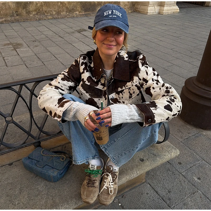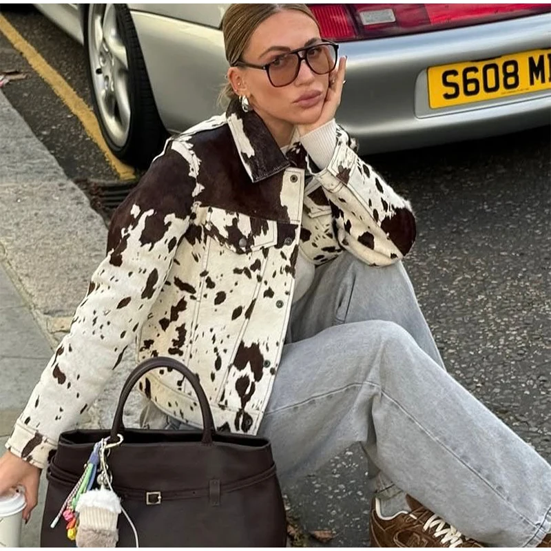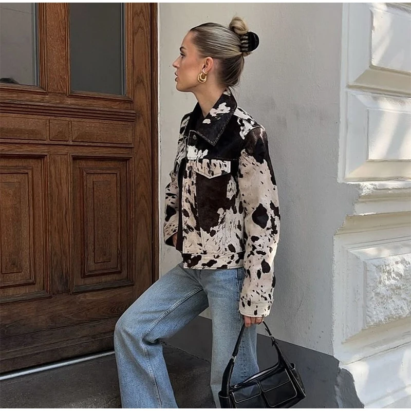 - Eye-catching cow print with vintage flair