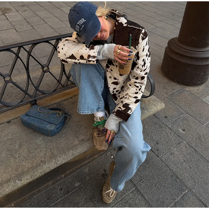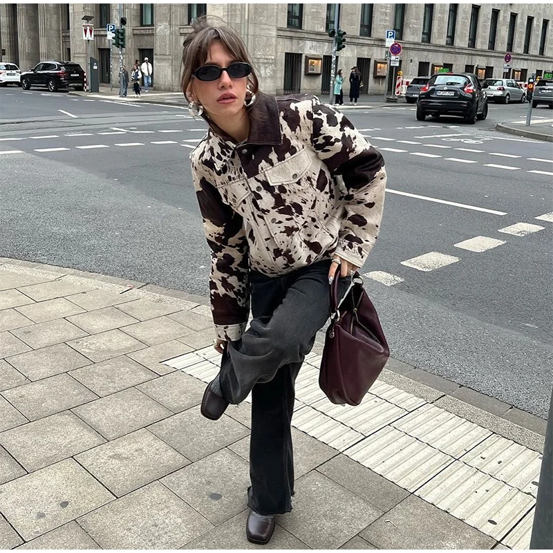 Aura La’Vintage Cow Print Cropped Jacket – Vintage Embroidered Lapel Outerwear for Fall