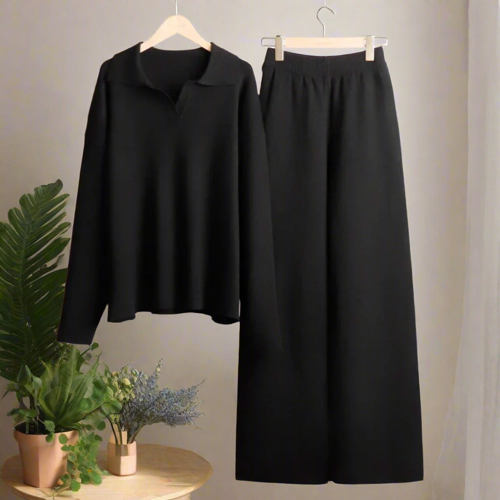 Experience luxury indulgence with the Oversized Cozy Collared Polo Soft Knit Sweater with matching wide legged stretch waist pants at LaurenNichole. This timeless sweater outfit is a must-have for any wardrobe and can be effortlessly styled for work, evening events, or leisure.