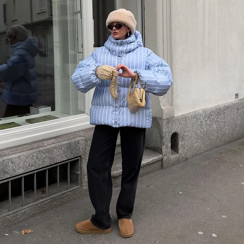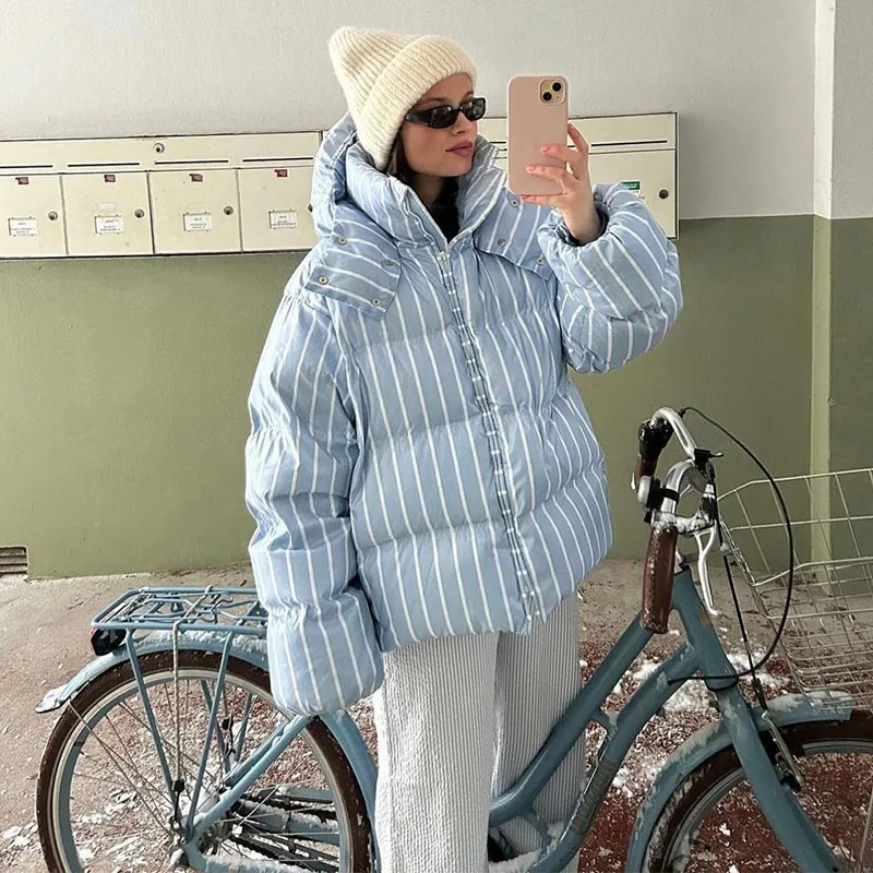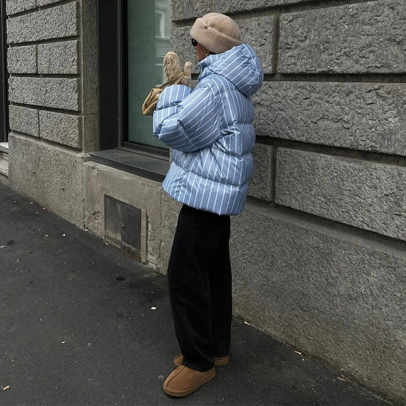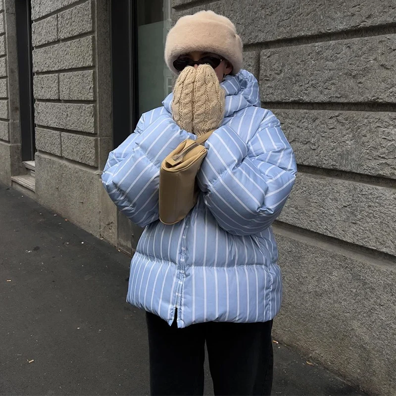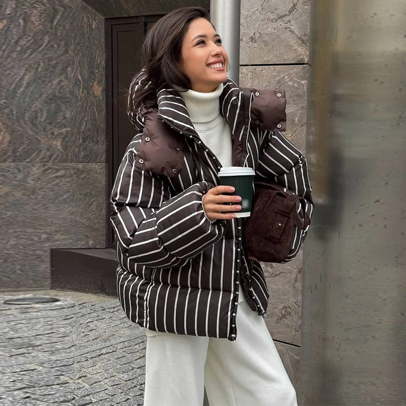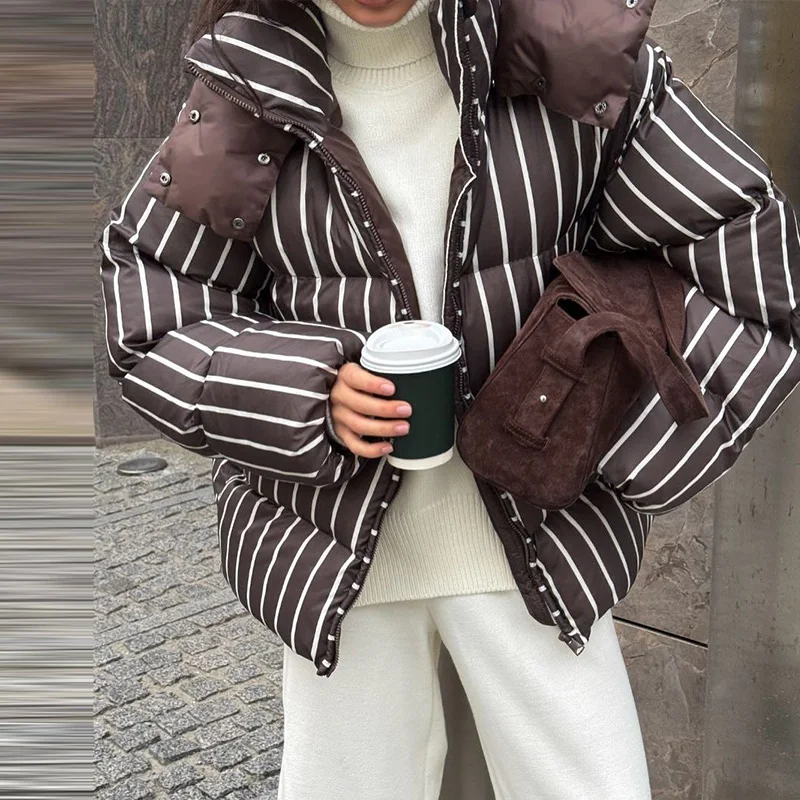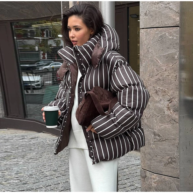 This jacket is provides cozy warmth, lightweight and water-resistant for the cold wet rain and snow. Our stripe puffer jacket traps body heat in air pockets created by insulation of cotton. The jackets lightweight nature also makes it easy for layering and styling with your fave sweaters, sweatshirts, shackets and more or extra warmth.